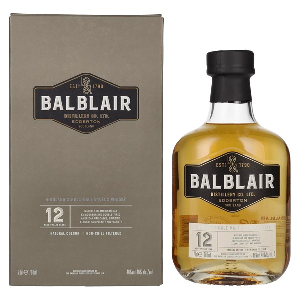 Το Balblair 12 Years Old Single Malt ενσωματώνει την απαλή κομψότητα των Highlands με τη λεπτή ισορροπία φρούτων, μπαχαρικών και γλυκύτητας. Ωριμασμένο σε βαρέλια αμερικανικής βελανιδιάς και διπλής απόσταξης αμερικανικής βελανιδιάς, αναπτύσσει μια κομψή πολυπλοκότητα και ζεστές νότες. Αυτό το single malt εντυπωσιάζει με το φυσικό του χρώμα και δεν φιλτράρεται με ψύξη