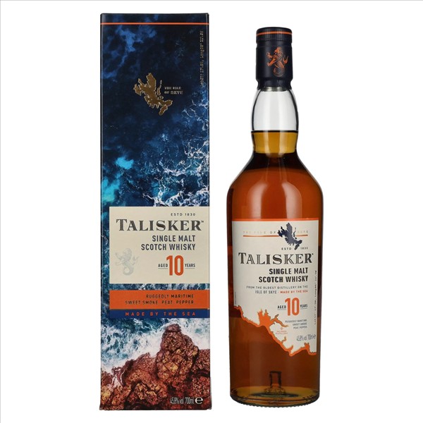 Το Talisker 10 ετών Single Malt Whisky είναι ένα θρυλικό ναυτικό σκωτσέζικο ουίσκι από το Isle of Skye στη Σκωτία. Ως το παλαιότερο και μοναδικό αποστακτήριο στο νησί, το Talisker ενσαρκώνει τέλεια τον άγριο, τραχύ χαρακτήρα της πατρίδας του. Γνωστό για τα έντονα καπνιστά και θαλασσινά αρώματά του, σε συνδυασμό με μια πικάντικη γλυκύτητα, αυτό το 10ετές single malt ωρίμανσης είναι ένα από τα κλασικά σκωτσέζικα ουίσκι.